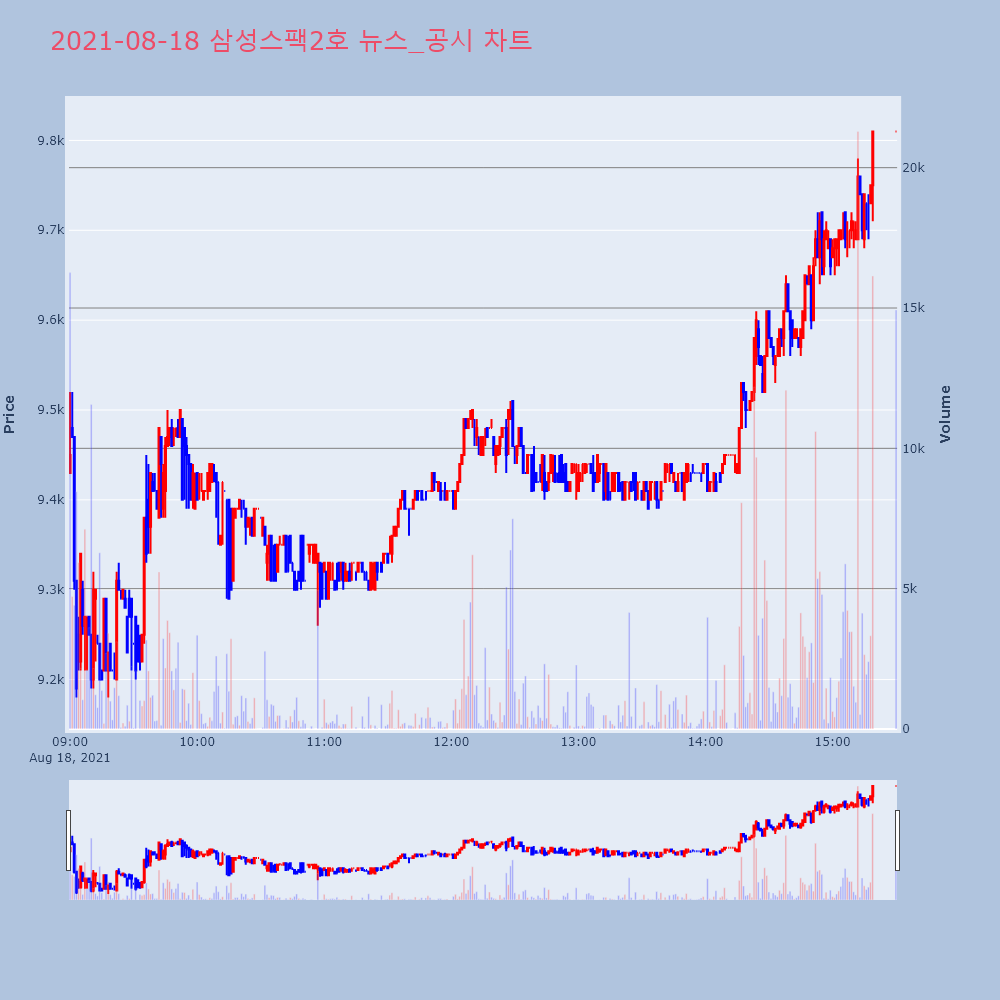 | 2 | 삼성스팩2호, +9.91% VI 발동삼성스팩2호(291230)가 VI가 발동했다. 전일 대 | 조선경제 | 삼성스팩2호 | 2021-08-17 09:37:01 |