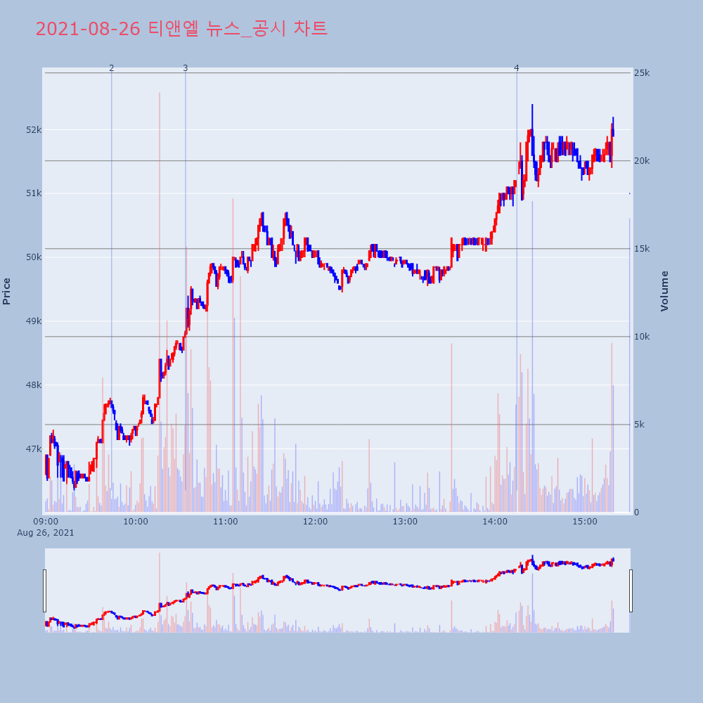 | 4 | 티앤엘, +10.34% VI 발동티앤엘(340570)이 VI가 발동했다. 전일 대비 1 | 조선경제 | 티앤엘 | 2021-08-26 14:14:38 |