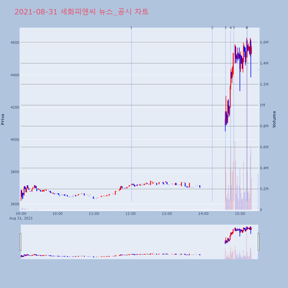 | 5 | 세화피앤씨, +27.07% VI 발동세화피앤씨(252500)가 VI가 발동했다. 전일 대비 | 조선경제 | 세화피앤씨 | 2021-08-31 14:49:53 |
