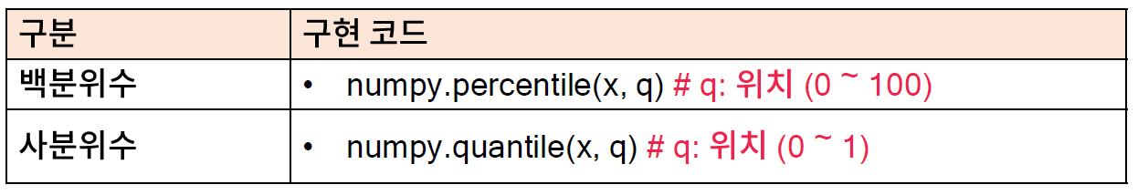 - 사분위 (quantile)는 데이터를 크기 순서대로 오름차순 정렬 했을 때, 4등분한 위치의 값을 의미