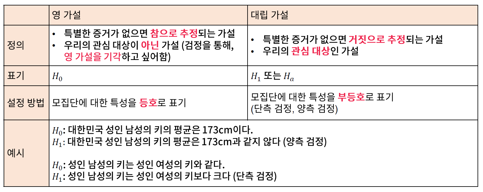 - 영 가설 (null hypothesis)와 대립 가설(alternative hypothesis)로 구분하여, 가설을 수립해야 한다.