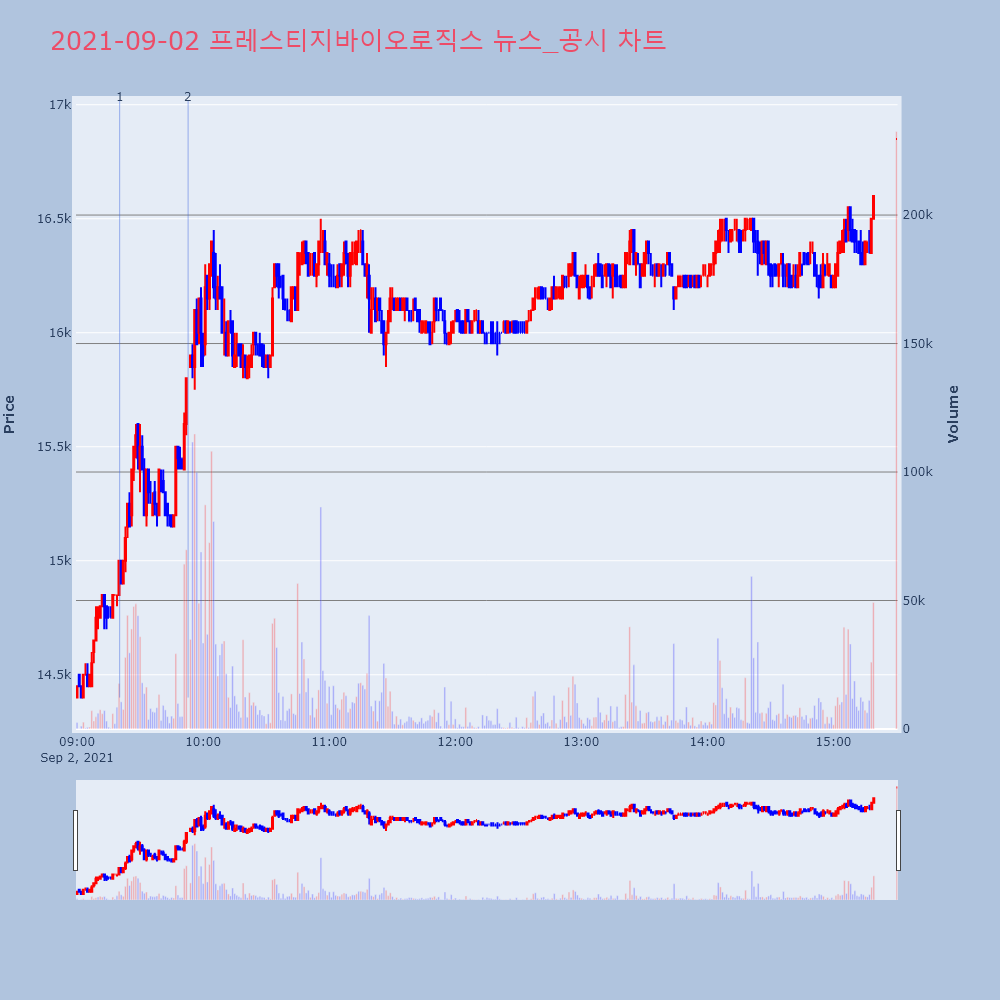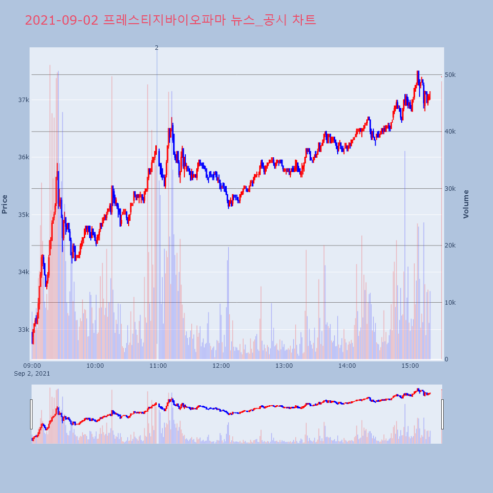 | 2 | 프레스티지바이오로직스, +9.72% VI 발동프레스티지바이오로직스(334970)가 VI가 발동했다. | 조선경제 | 프레스티지바이오로직스 | 2021-09-02 09:52:51 |