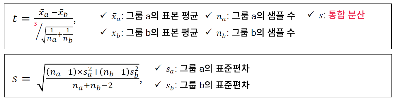 - 등분산성 : 두 그룹의 데이터에 대한 부산이 같아야 한다.