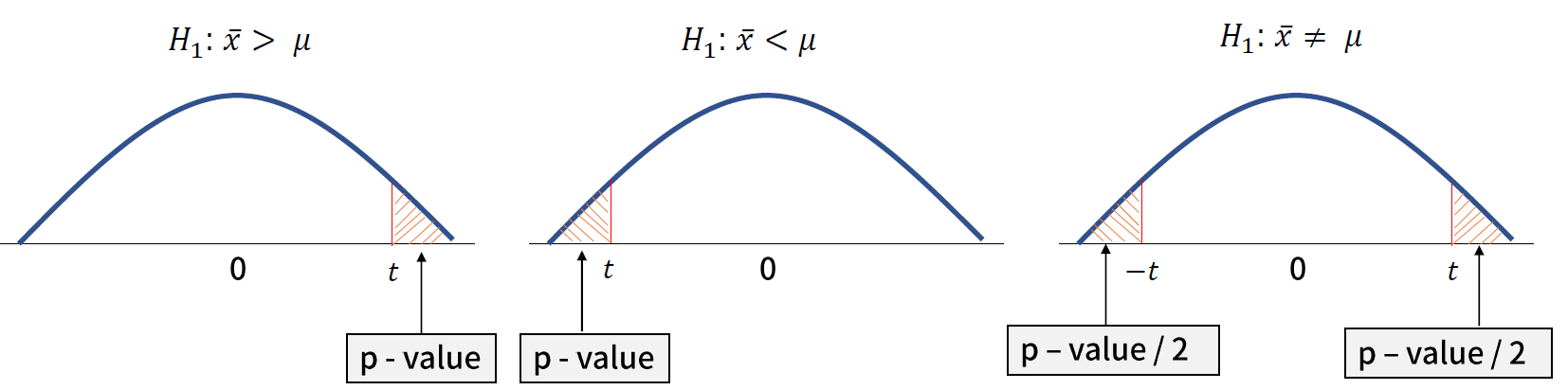 - 위에 제시된 통계량을 t분포 상에 위치시키는 방식으로 p-value 를 계산