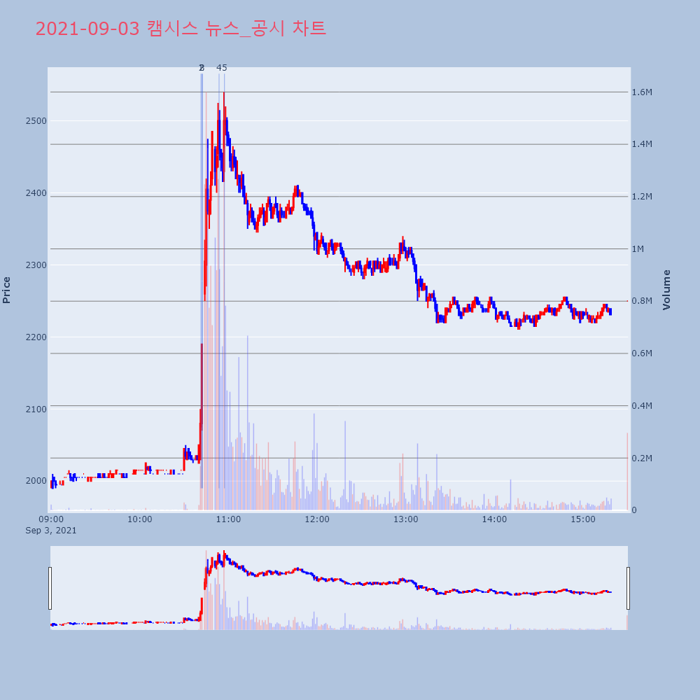 | 3 | 캠시스, +8.54% VI 발동캠시스(050110)가 VI가 발동했다. 전일 대비 8 | 조선경제 | 캠시스 | 2021-09-03 10:42:31 |