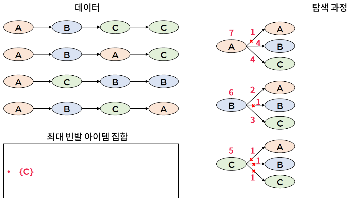 * 순서를 고려한 연관규칙 탐사 (예시 : L = 2, 최소 지지도 = 2)