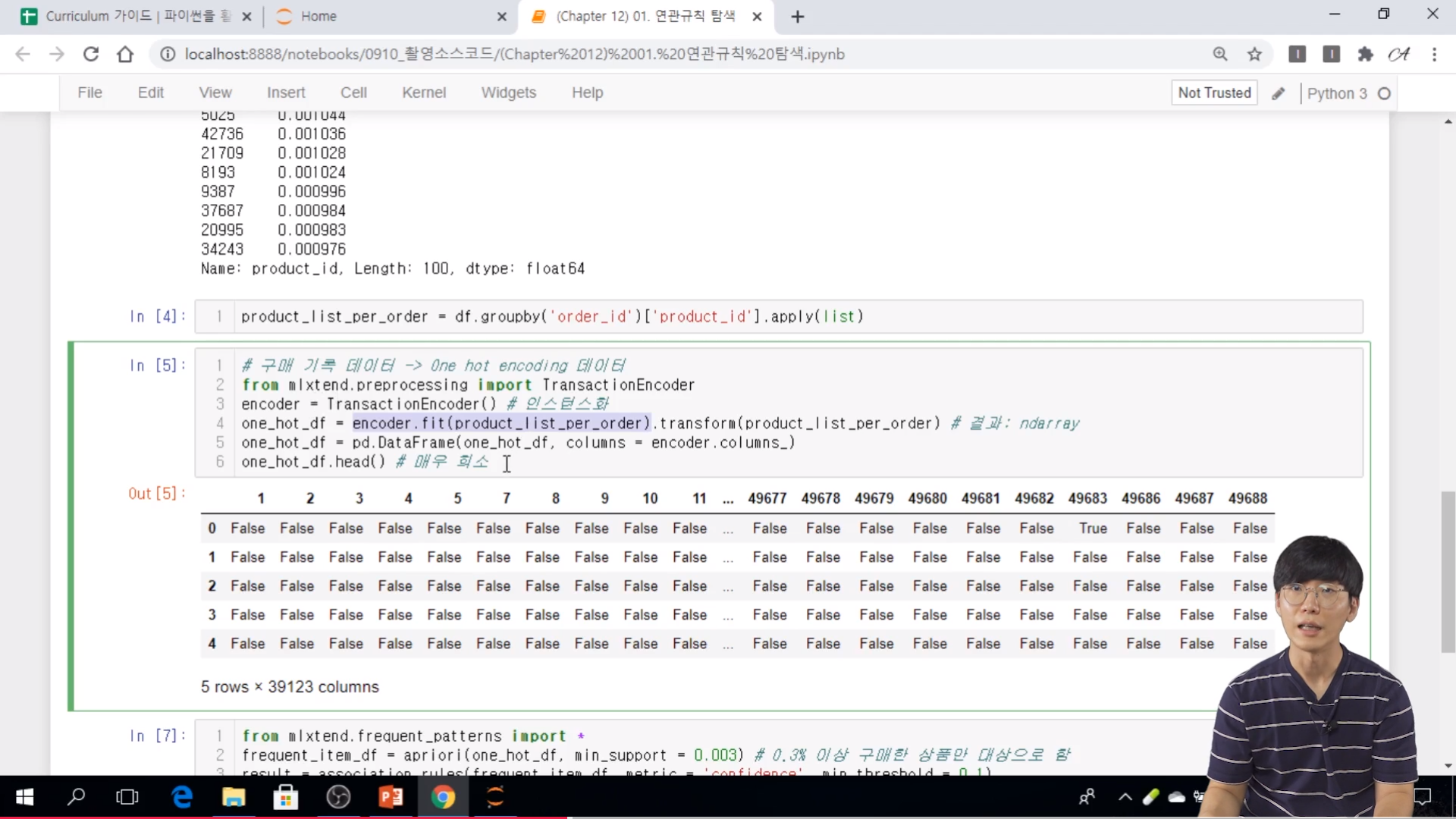// TransactionEncoder 로 instance 를 시켜서 fit 를 학습을 시키는 것이다. 거기에 transform 을 해줘야 한다.