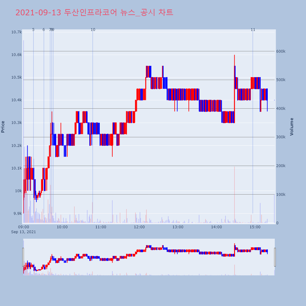 | 13 | [특징주]'유상증자 결정' 두산인프라코어 5.88% 하락 제목 : [특징주]'유상증자 결정' 두산인프라코어 5. | 인포스탁 | 두산인프라코어 | 2021-09-13 16:36:22 |