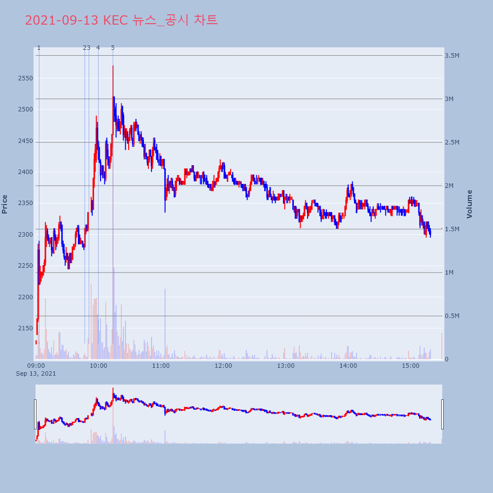| 3 | KEC, +9.88% VI 발동KEC(092220)가 VI가 발동했다. 전일 대비 9 | 조선경제 | KEC | 2021-09-13 09:50:51 |