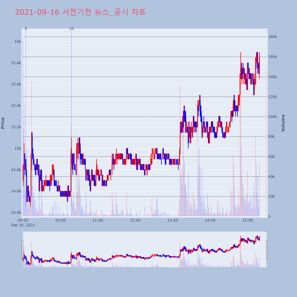 | 6 | 서전기전, +18.86% VI 발동서전기전(189860)이 VI가 발동했다. 전일 대비 | 조선경제 | 서전기전 | 2021-09-15 09:56:56 |