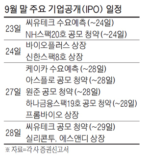 9월 말 공모주 시장에선 씨유테크와 케이카가 수요예측에 나선다. 대어급으로 기대를 모았던 시몬느액세서리컬렉션과 카카오페이는 공모 일정을 미뤘다. 스마트폰 부품업체 씨유테크는 23~24일 양일 동안 기관 수요예측을 진행한다. 총 525만주를 공모하며 희망 가격 범위는 5100~5600원 사이다. 공모가 상단 기준 294억원을 모집하게 되는 것이다. 상장 예상 시가총액은 최대 1390억원이다. 대신증권이 대표 주관 업무를 맡았다. 씨유테크의 일반 청약은 28~29일로 예정돼 있다.