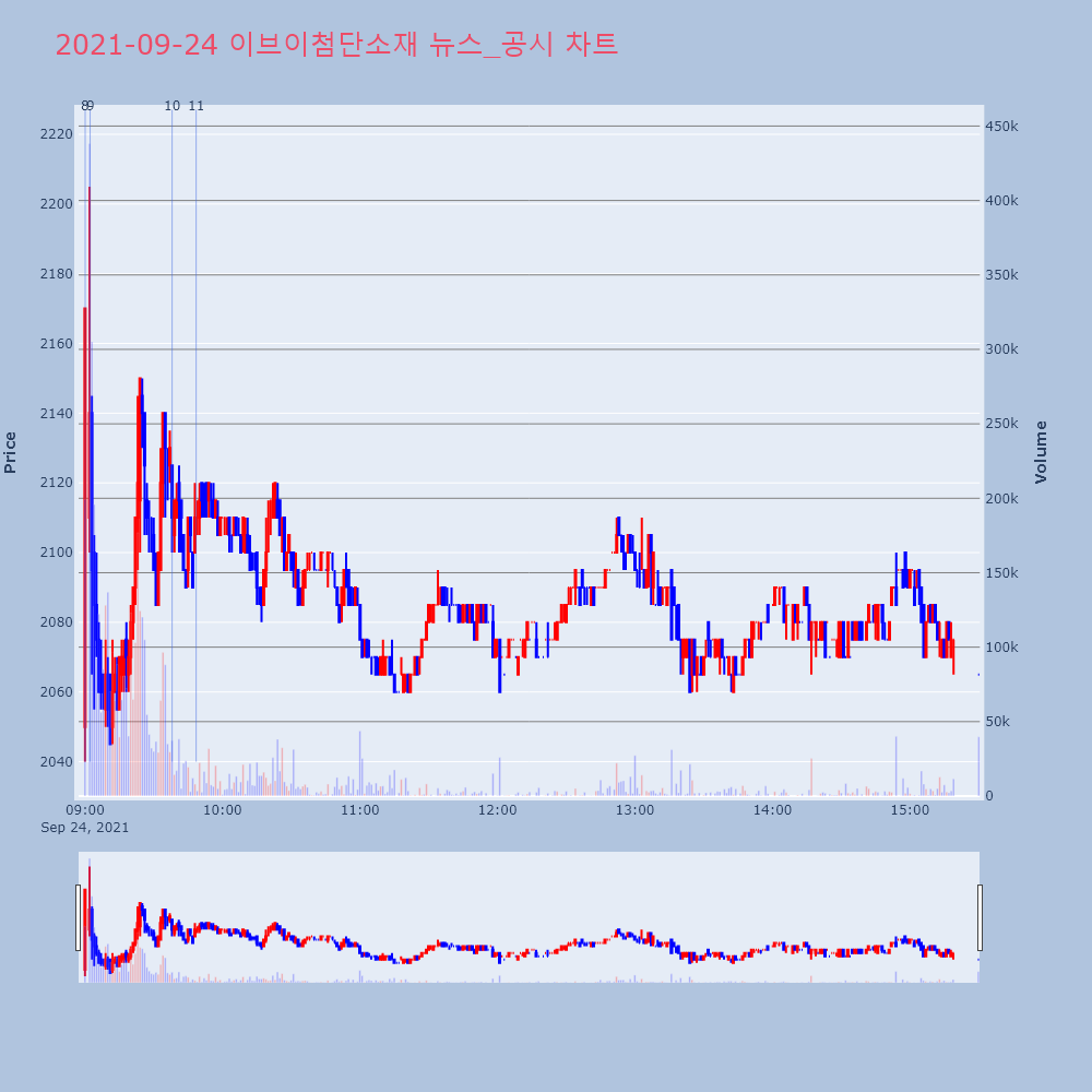 | 9 | 이브이첨단소재, +5.50% 상승폭 확대이브이첨단소재(131400)가 상승폭을 확대하고 있다. | 조선경제 | 이브이첨단소재 | 2021-09-24 09:02:14 |