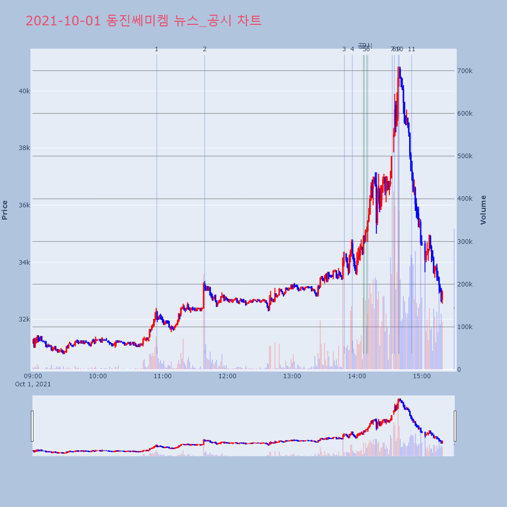 | 7 | 동진쎄미켐(005290) 상승폭 확대 +19.87%, VI발동 제목 : 동진쎄미켐(005290)상승폭 확대 +19.8 | 인포스탁 | 동진쎄미켐 | 2021-10-01 14:32:40 |