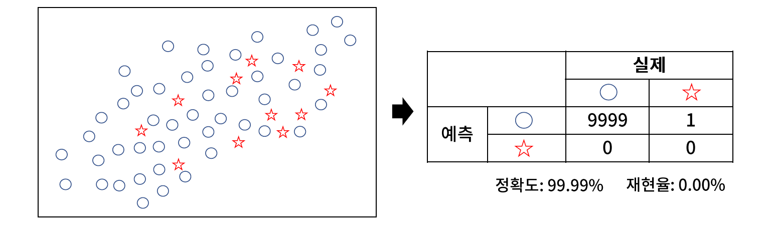 // 클래스 불균형 문제가 있는 모델은 정확도가 높고, 재현율이 매우 낮은 경향이 있다.