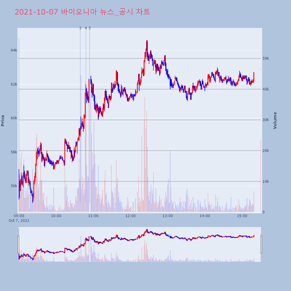 | 5 | 바이오니아, +13.89% VI 발동바이오니아(064550)가 VI가 발동했다. 전일 대비 | 조선경제 | 바이오니아 | 2021-10-07 10:54:01 |