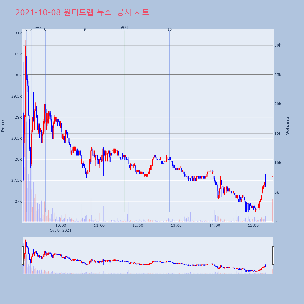 | 4 | 원티드랩, +10.71% VI 발동원티드랩(376980)이 VI가 발동했다. 전일 대비 | 조선경제 | 원티드랩 | 2021-10-07 12:27:00 |