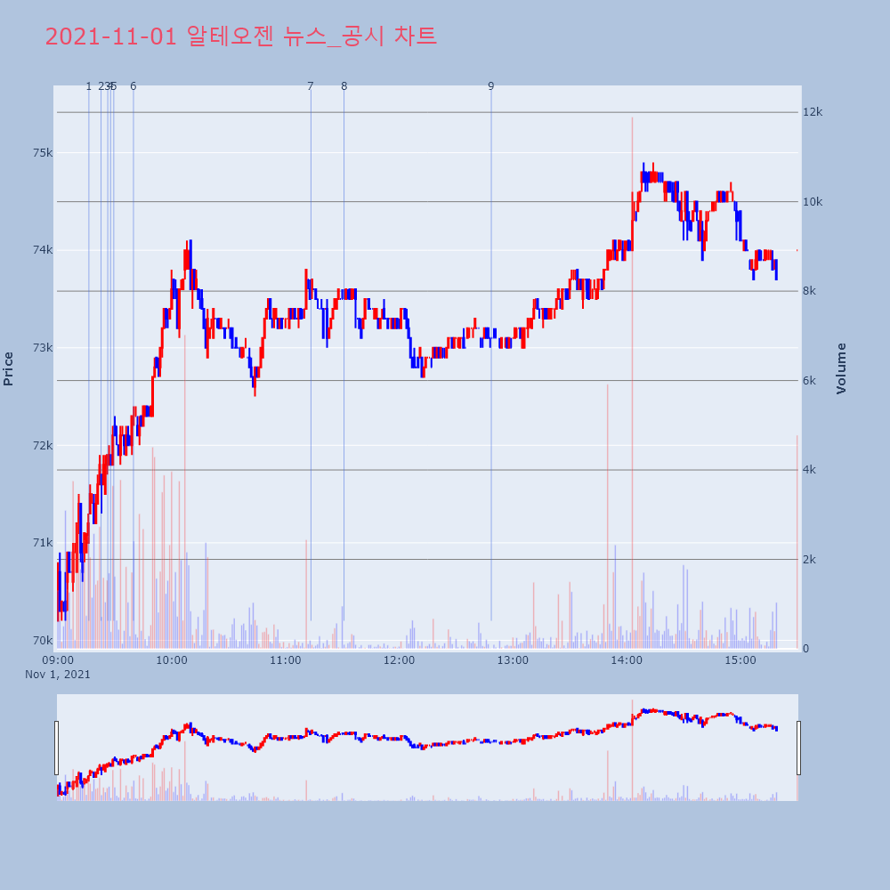 | 8 | [장중수급포착] 알테오젠, 외국인 36,374주 대량 순매수... 주가 +5.00% [서울=뉴스핌] 로보뉴스 = 01일 11시 30분 현재 | 뉴스핌 | 알테오젠 | 2021-11-01 11:30:56 |