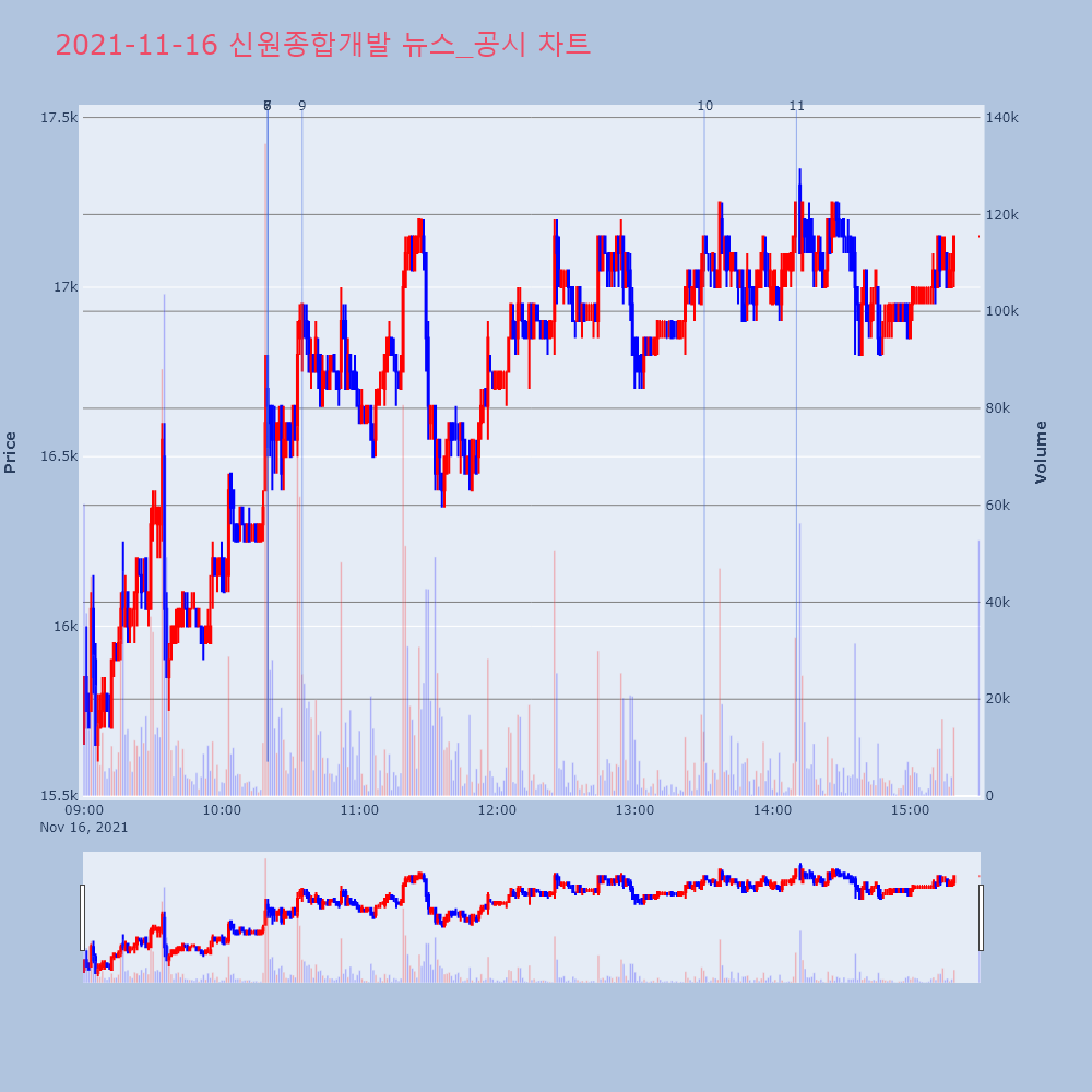 | 11 | 신원종합개발, +11.29% VI 발동신원종합개발(017000)이 VI가 발동했다. 전일 대 | 조선경제 | 신원종합개발 | 2021-11-16 14:10:28 |