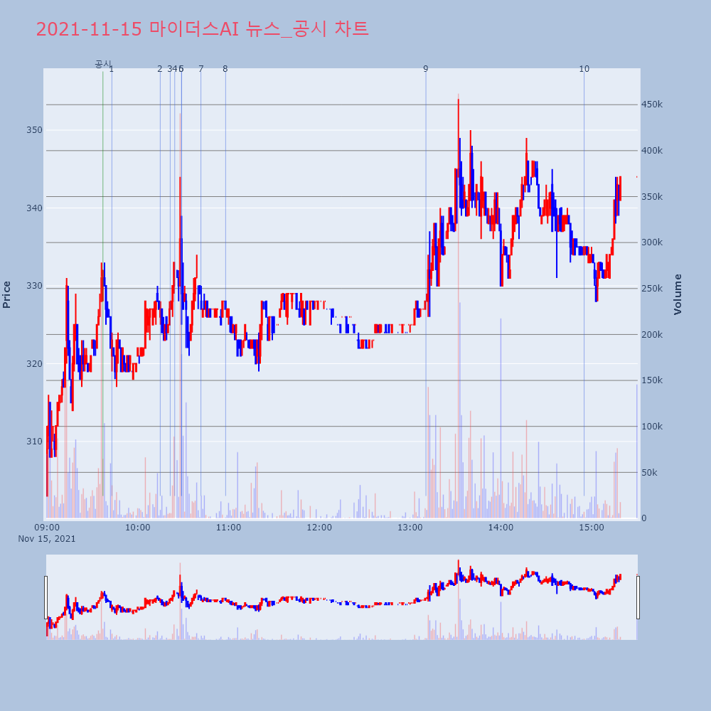 | 4 | 마이더스AI, +9.90% VI 발동마이더스AI(222810)가 VI가 발동했다. 전일 대 | 조선경제 | 마이더스AI | 2021-11-15 10:24:28 |