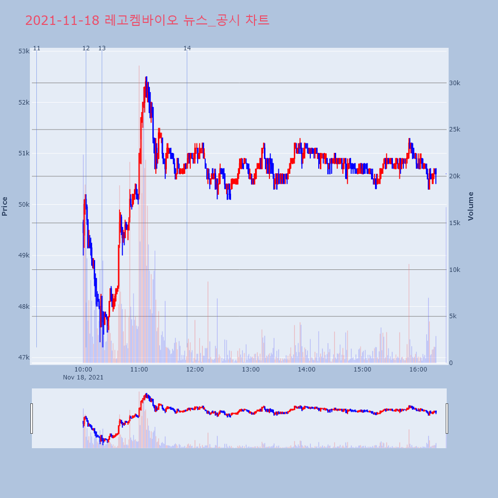 | 10 | 레고켐바이오, 1.2조 규모 기술이전 체결 소식에 강세[머니투데이 김근희 기자] [특징주]레고켐바이오사이언스 | 머니투데이 | 레고켐바이오 | 2021-11-17 09:25:24 |