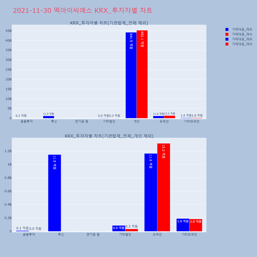 | 투자기관 | 거래량_매도 | 거래량_매수 | 거래량_순매수 | 거래대금_매도 | 거래대금_매수 | 거래대금_순매수 |