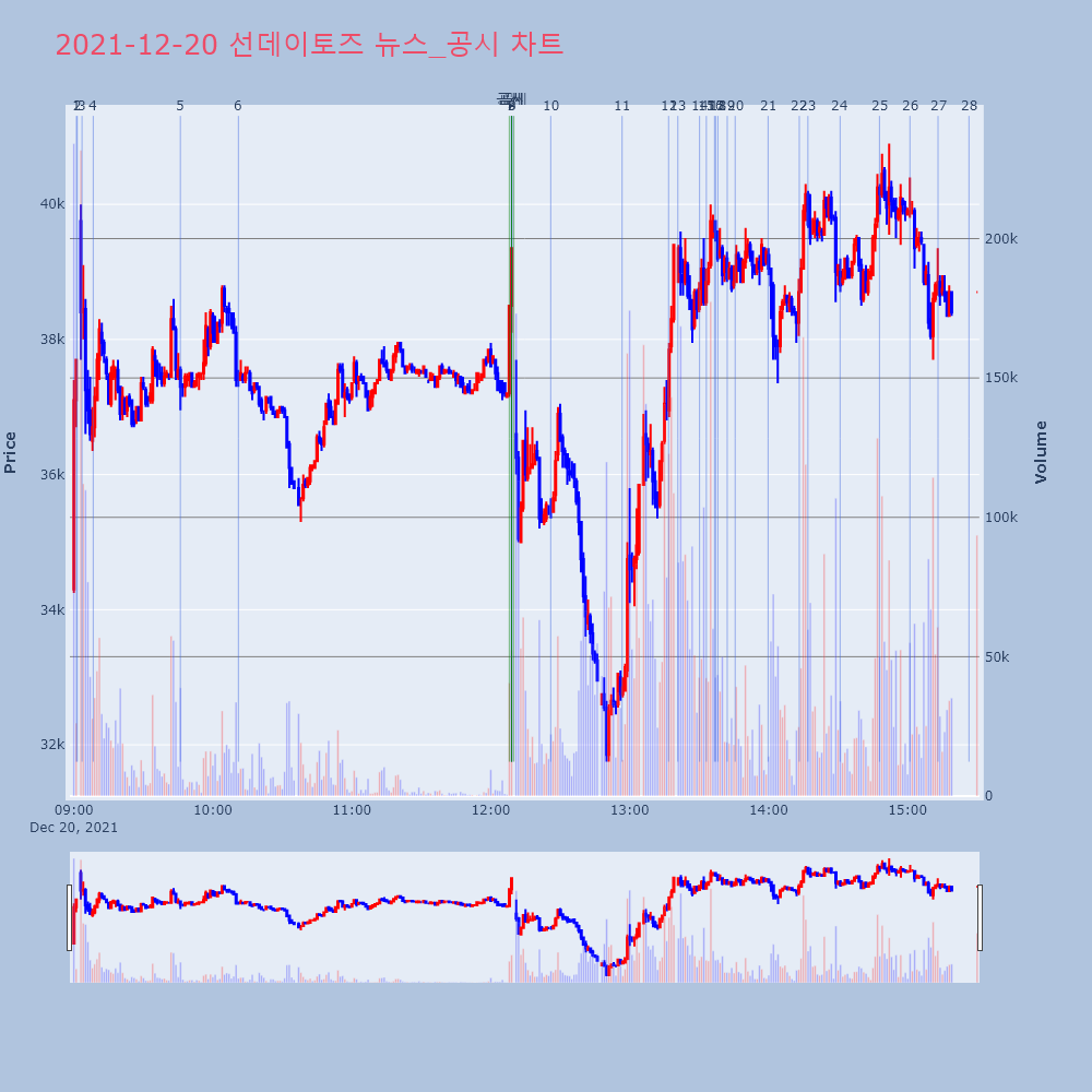 | 1 | 선데이토즈, +17.81% VI 발동선데이토즈(123420)가 VI가 발동했다. 전일 대비 | 조선경제 | 선데이토즈 | 2021-12-20 09:01:05 |