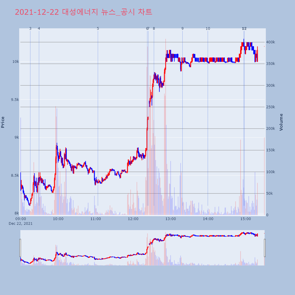 | 7 | 대성에너지, +16.90% VI 발동대성에너지(117580)가 VI가 발동했다. 전일 대비 | 조선경제 | 대성에너지 | 2021-12-22 12:24:22 |