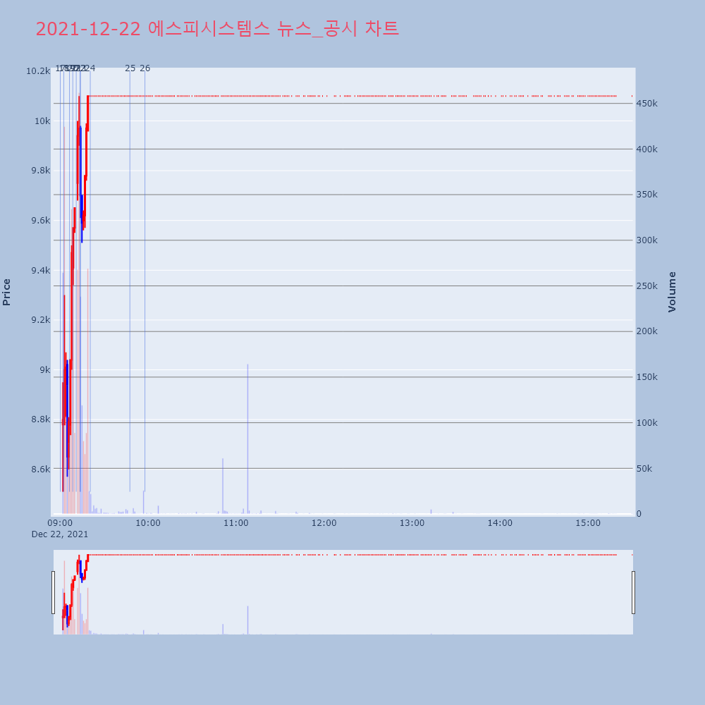 | 23 | [이시각 상한가] 에스피시스템스(▲2320) - 22일 오전 9시13분[이투데이/e2BOT 기자(e2bot@etoday.co | 이투데이 | 에스피시스템스 | 2021-12-22 09:14:03 |