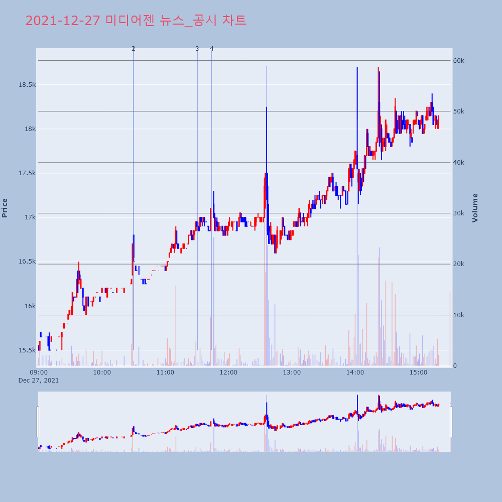 | 3 | [장중수급포착] 미디어젠, 외국인 15,516주 대량 순매수... 주가 +8.31% [서울=뉴스핌] 로보뉴스 = 27일 11시 30분 현재 | 뉴스핌 | 미디어젠 | 2021-12-27 11:30:35 |
