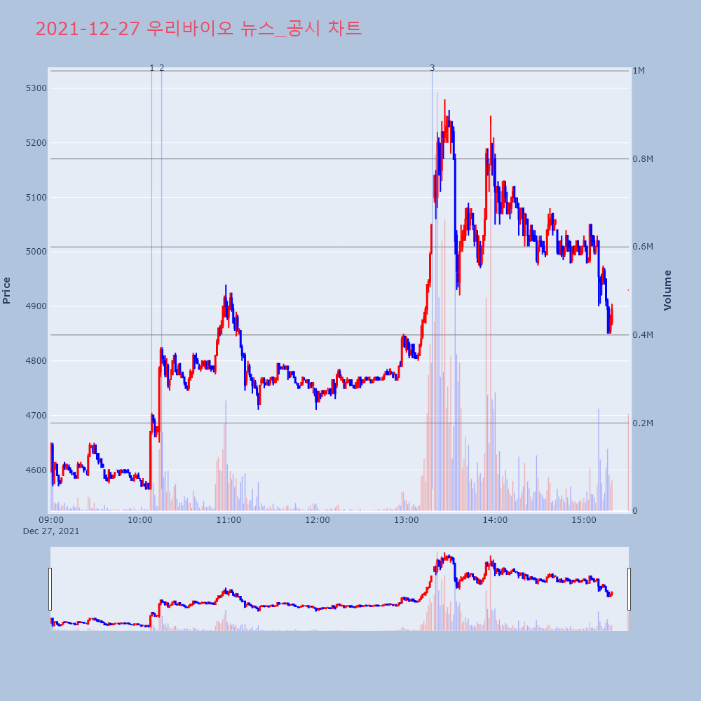 | 3 | 우리바이오, +11.85% VI 발동우리바이오(082850)가 VI가 발동했다. 전일 대비 | 조선경제 | 우리바이오 | 2021-12-27 13:17:32 |