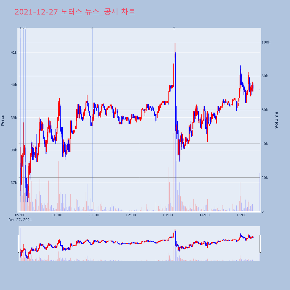 | 5 | 노터스, +16.17% VI 발동노터스(278650)가 VI가 발동했다. 전일 대비 1 | 조선경제 | 노터스 | 2021-12-27 13:10:38 |