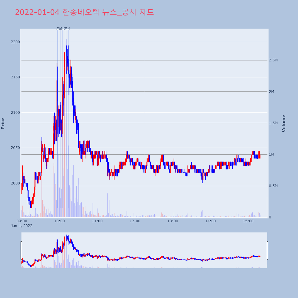 | 4 | 한송네오텍, 자회사 2차전지 소재 공급 소식에 5% 넘게 올라한송네오텍 주가가 5% 넘게 오르고 있다. 2차전지 | 한경/증권 | 한송네오텍 | 2022-01-03 11:08:57 |