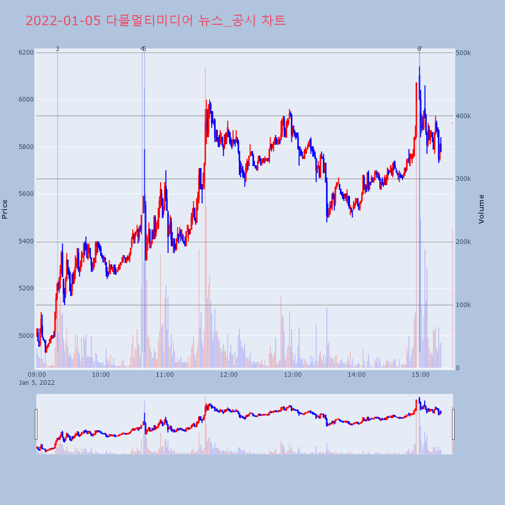| 5 | 다믈멀티미디어, +11.51% 상승폭 확대다믈멀티미디어(093640)가 상승폭을 확대하고 있다. | 조선경제 | 다믈멀티미디어 | 2022-01-05 10:41:05 |