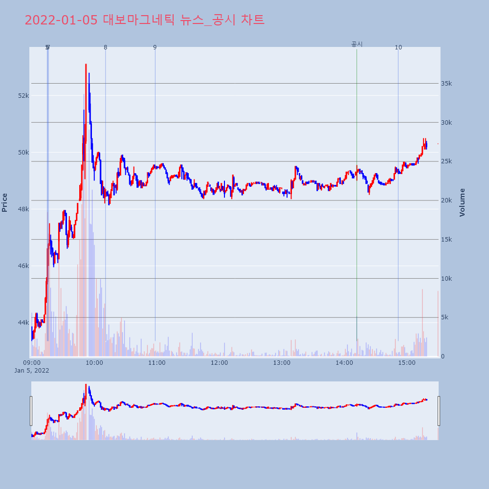 | 7 | '대보마그네틱' 52주 신고가 경신, 단기·중기 이평선 정배열로 상승세◆ 차트 분석- 단기·중기 이평선 정배열로 상승세 | 한경/증권 | 대보마그네틱 | 2022-01-05 09:16:05 |