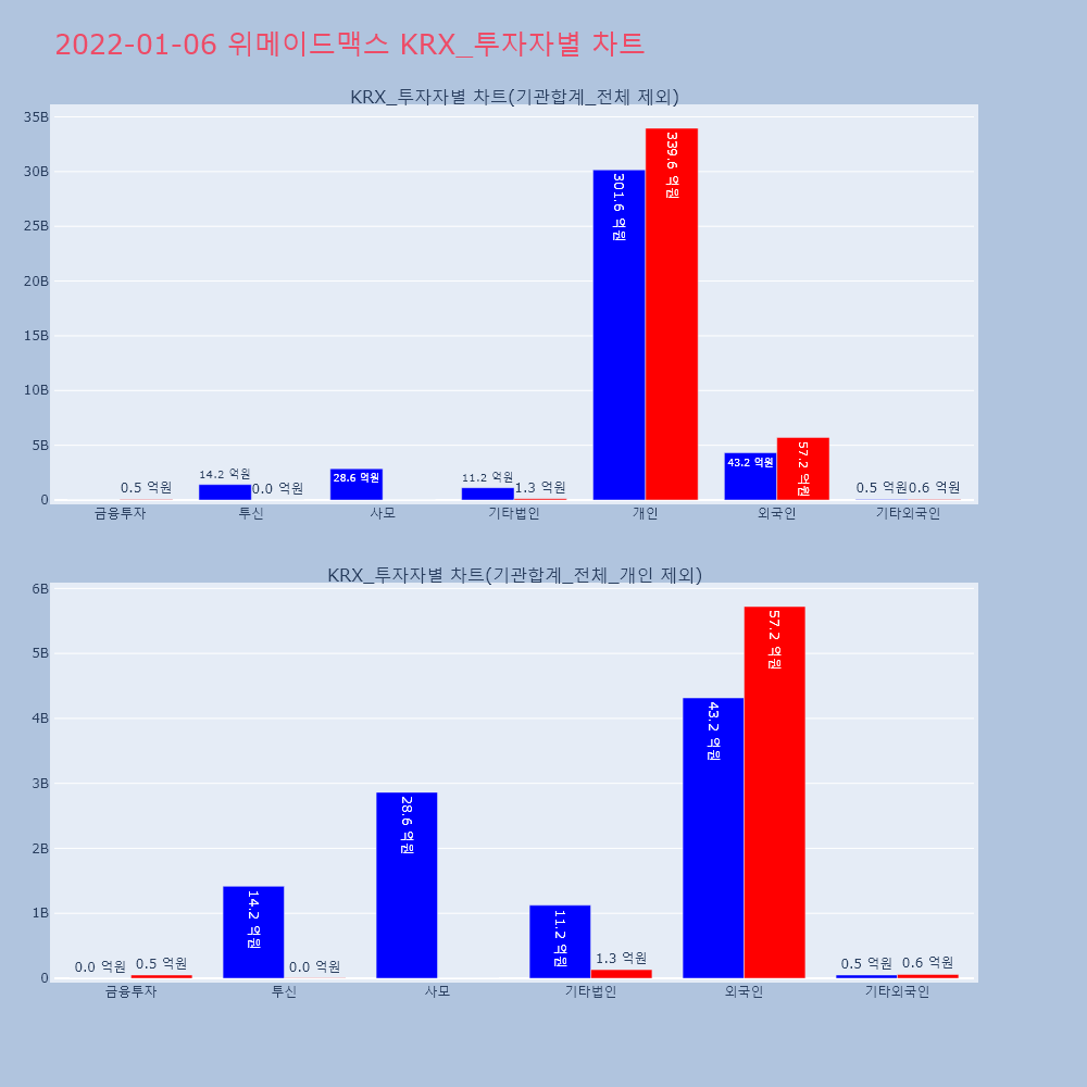 | 6 | 05일, 기관 코스닥에서 위메이드(-7.45%), 엘앤에프(-4.43%) 등 순매도기관 투자자는 05일 코스닥에서 위메이드, 엘앤에프, | 한경/증권 | 위메이드 | 2022-01-05 18:35:19 |