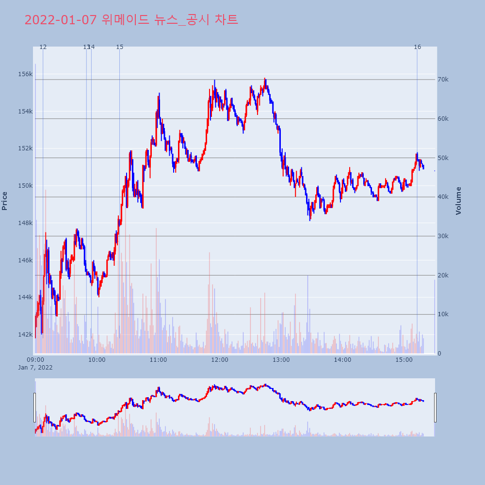 | 14 | [특징주] 위메이드, 디지털 자산 은행 전략적 투자 소식에 7%↑ 제목 : [특징주] 위메이드, 디지털 자산 은행 전략적 | 인포스탁 | 위메이드 | 2022-01-07 09:54:38 |