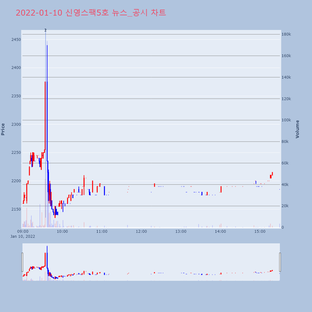 | 2 | 신영스팩5호, +10.72% VI 발동신영스팩5호(323280)가 VI가 발동했다. 전일 대 | 조선경제 | 신영스팩5호 | 2022-01-10 09:34:36 |