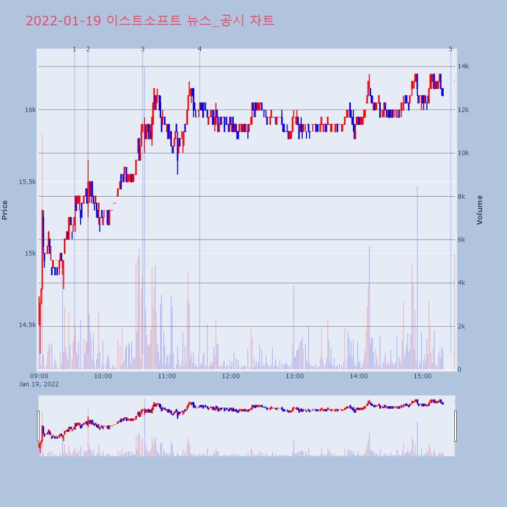 | 4 | [장중수급포착] 이스트소프트, 외국인/기관 동시 순매수… 주가 +7.74% [서울=뉴스핌] 로보뉴스 = 19일 11시 30분 현재 | 뉴스핌 | 이스트소프트 | 2022-01-19 11:30:48 |