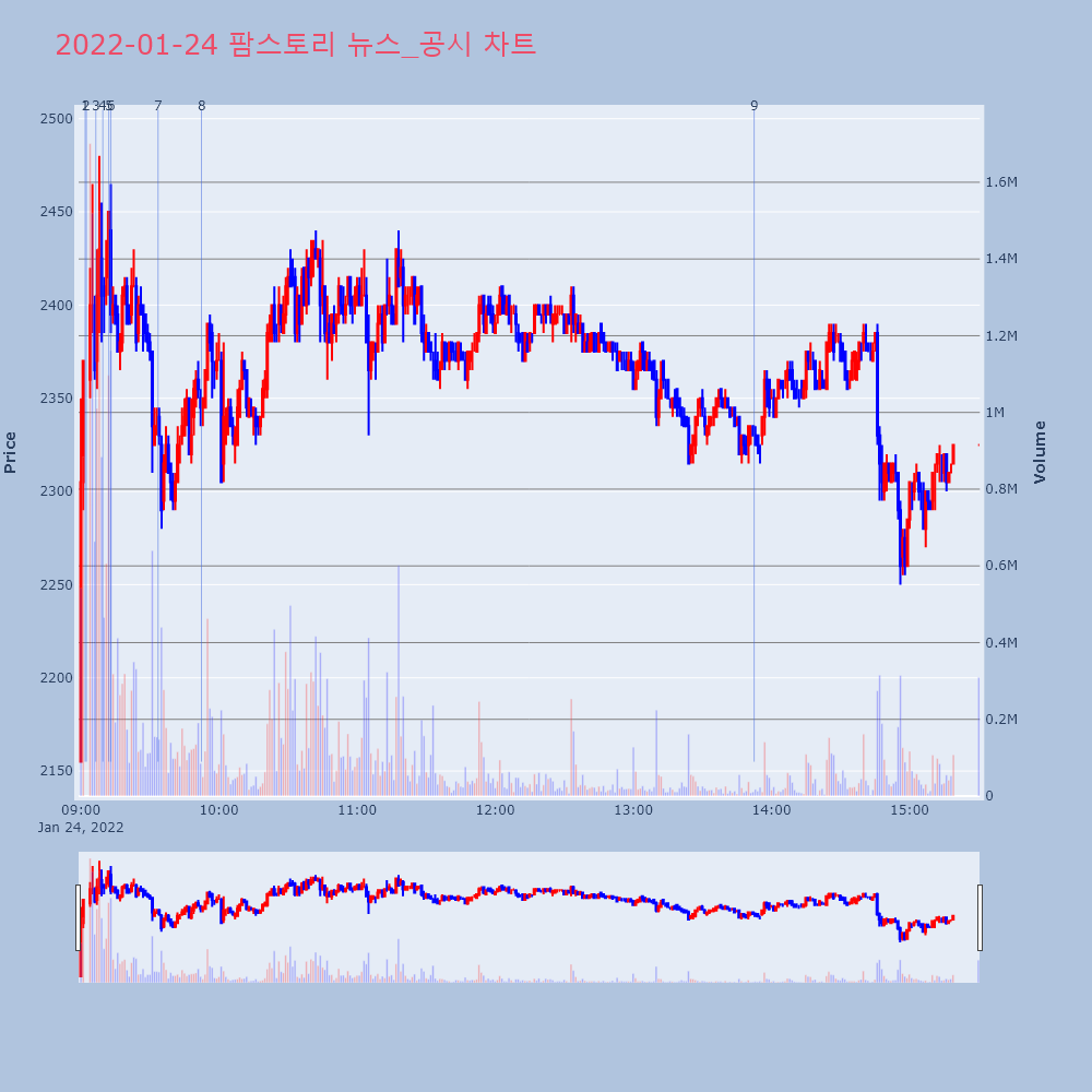 1 | 팜스토리, +13.67% VI 발동팜스토리(027710)가 VI가 발동했다. 전일 대비 | 조선경제 | 팜스토리 | 2022-01-24 09:01:51 |