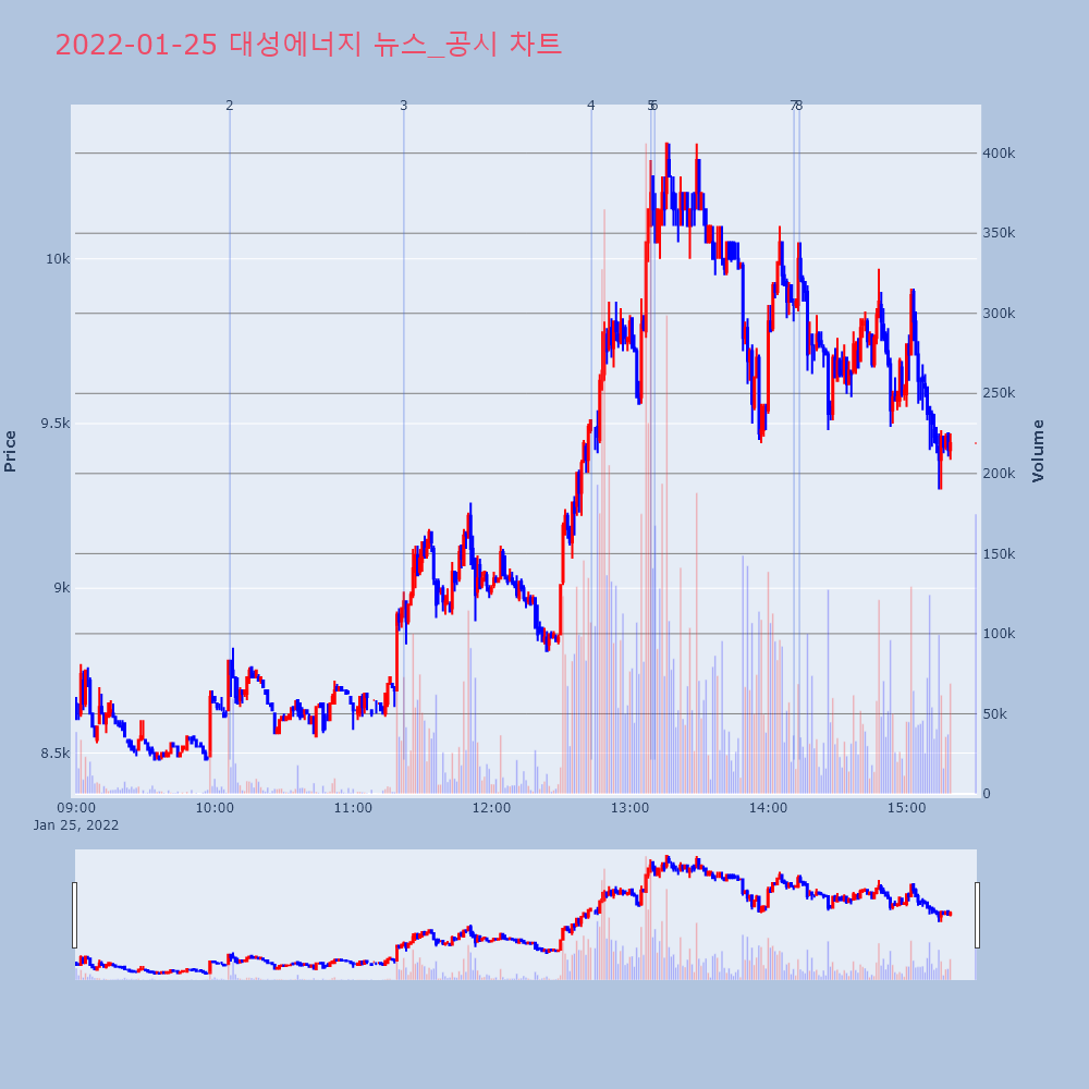 | 4 | 대성에너지, +13.76% VI 발동대성에너지(117580)가 VI가 발동했다. 전일 대비 | 조선경제 | 대성에너지 | 2022-01-25 12:43:22 |
