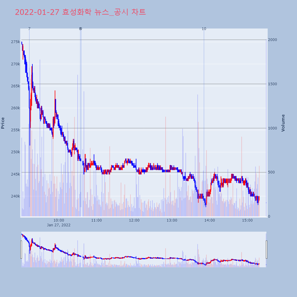 | 9 | 효성화학, -12.68% VI 발동효성화학(298000)이 VI가 발동했다. 전일 대비 | 조선경제 | 효성화학 | 2022-01-27 10:35:39 |