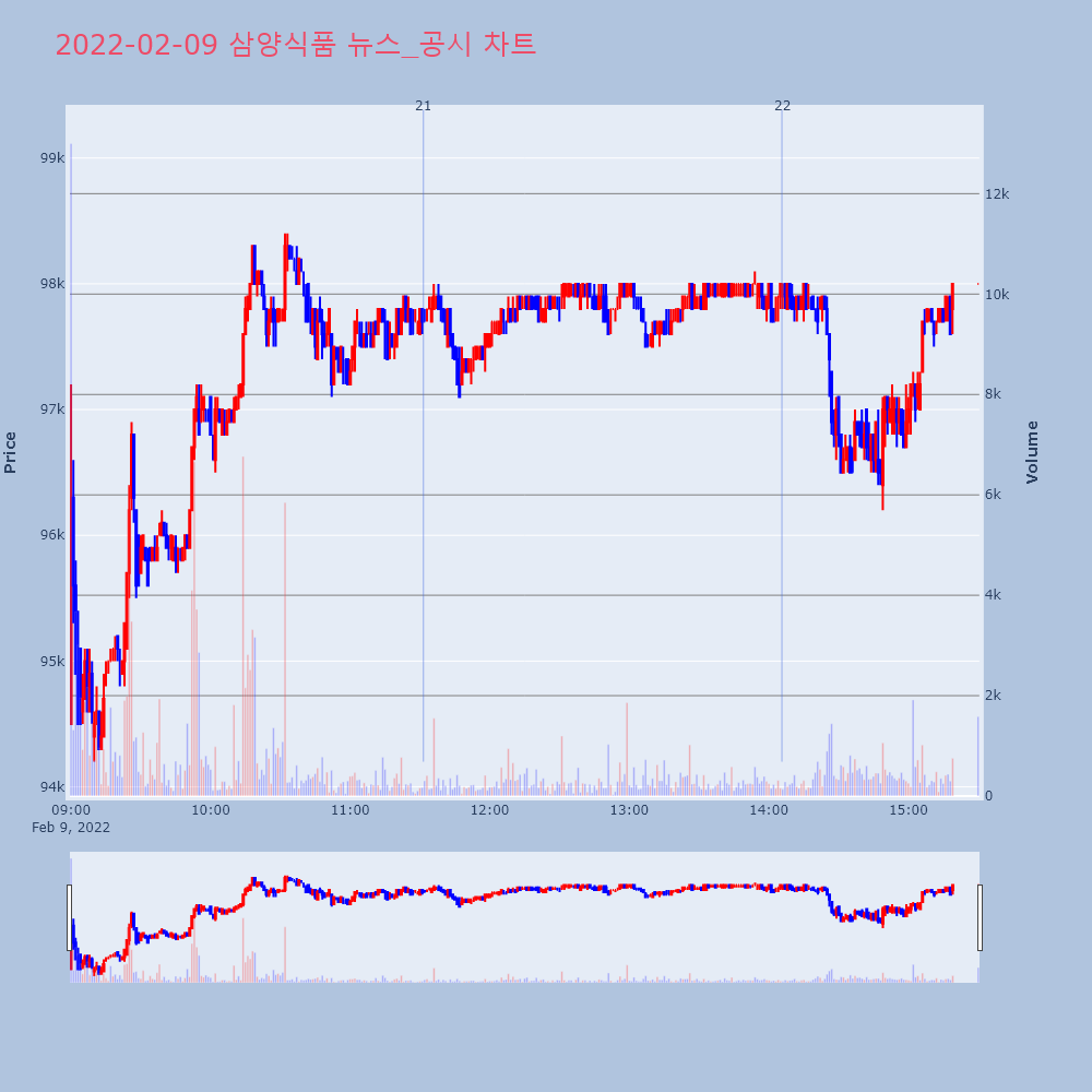 | 21 | [장중수급포착] 삼양식품, 기관 9일 연속 순매수행진... 주가 +7.01% [서울=뉴스핌] 로보뉴스 = 09일 11시 30분 현재 | 뉴스핌 | 삼양식품 | 2022-02-09 11:31:30 |