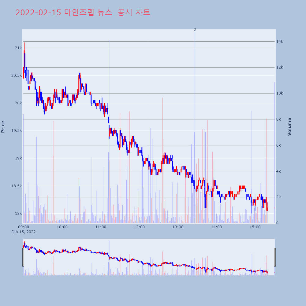 | 2 | 마인즈랩, -12.14% VI 발동마인즈랩(377480)이 VI가 발동했다. 전일 대비 | 조선경제 | 마인즈랩 | 2022-02-15 13:26:26 |
