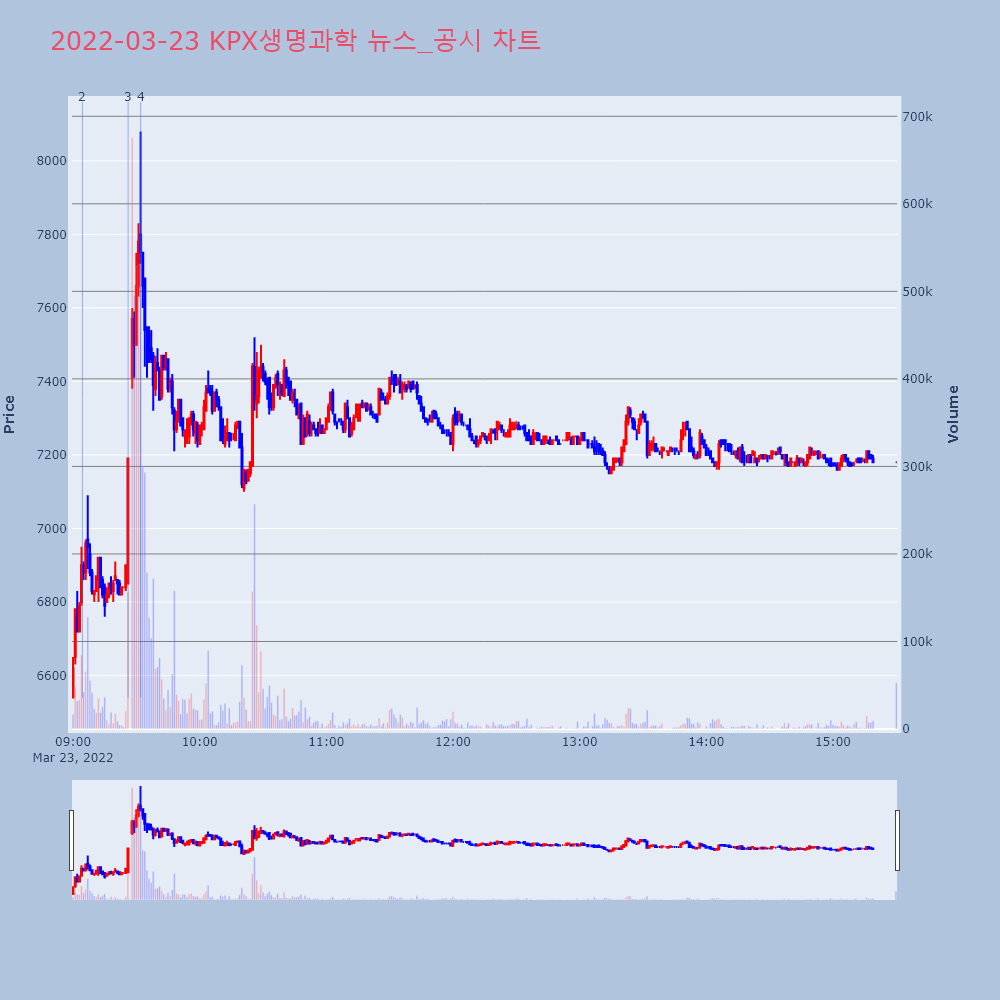 | 3 | KPX생명과학, +10.79% VI 발동KPX생명과학(114450)이 VI가 발동했다. 전일 | 조선경제 | KPX생명과학 | 2022-03-23 09:26:05 |