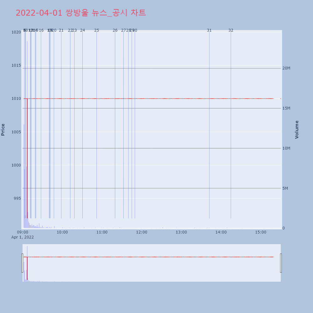 | 18 | [특징주] 쌍방울그룹株, 쌍용차 인수설에 급등…광림·쌍방울 ‘상한가’쌍방울그룹주가 장 초반부터 상한가에 진입하는 등 일제히 | 조선경제 | 쌍방울 | 2022-04-01 09:20:00 |