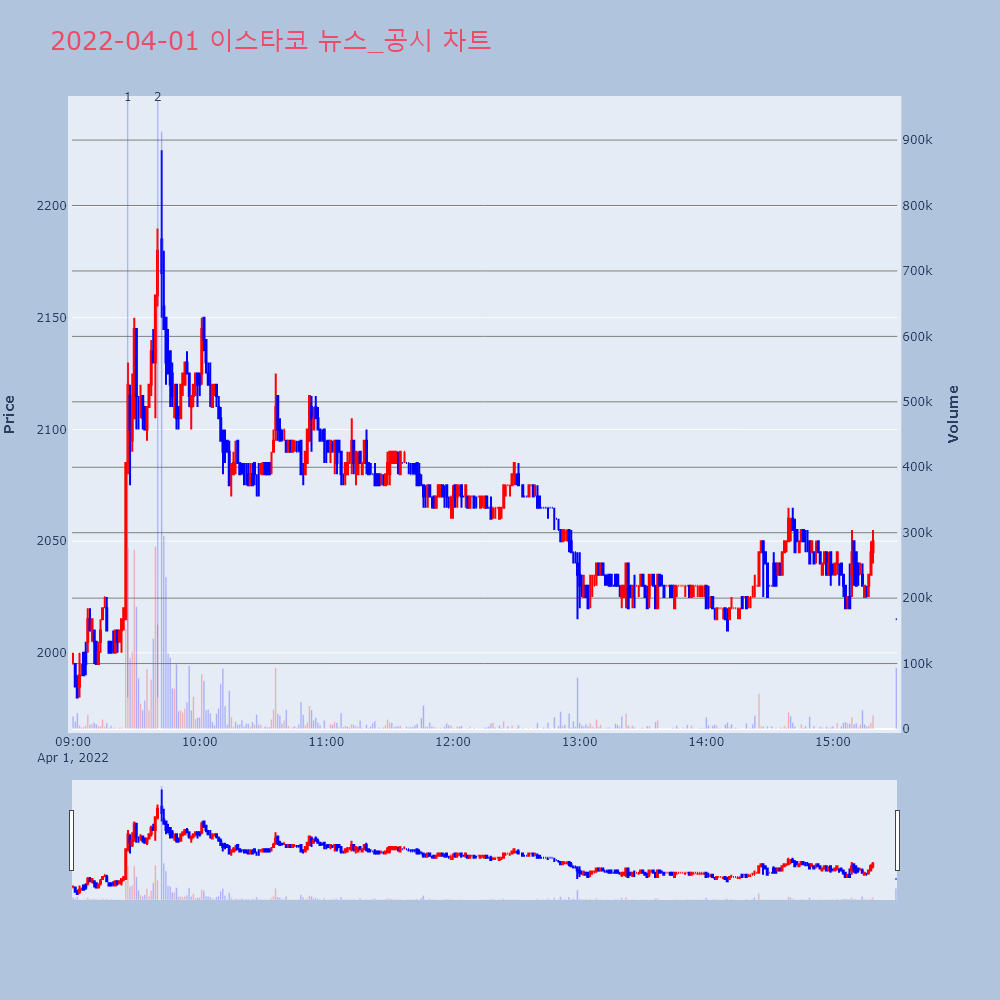 | 2 | 이스타코, +8.96% VI 발동이스타코(015020)가 VI가 발동했다. 전일 대비 | 조선경제 | 이스타코 | 2022-04-01 09:40:09 |
