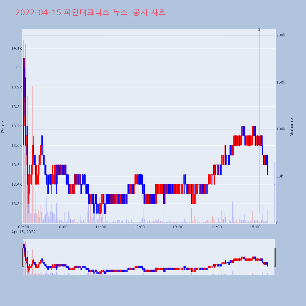 | 3 | '파인테크닉스' 52주 신고가 경신, 단기·중기 이평선 정배열로 상승세◆ 차트 분석- 단기·중기 이평선 정배열로 상승세 | 한경/증권 | 파인테크닉스 | 2022-04-14 14:57:10 |