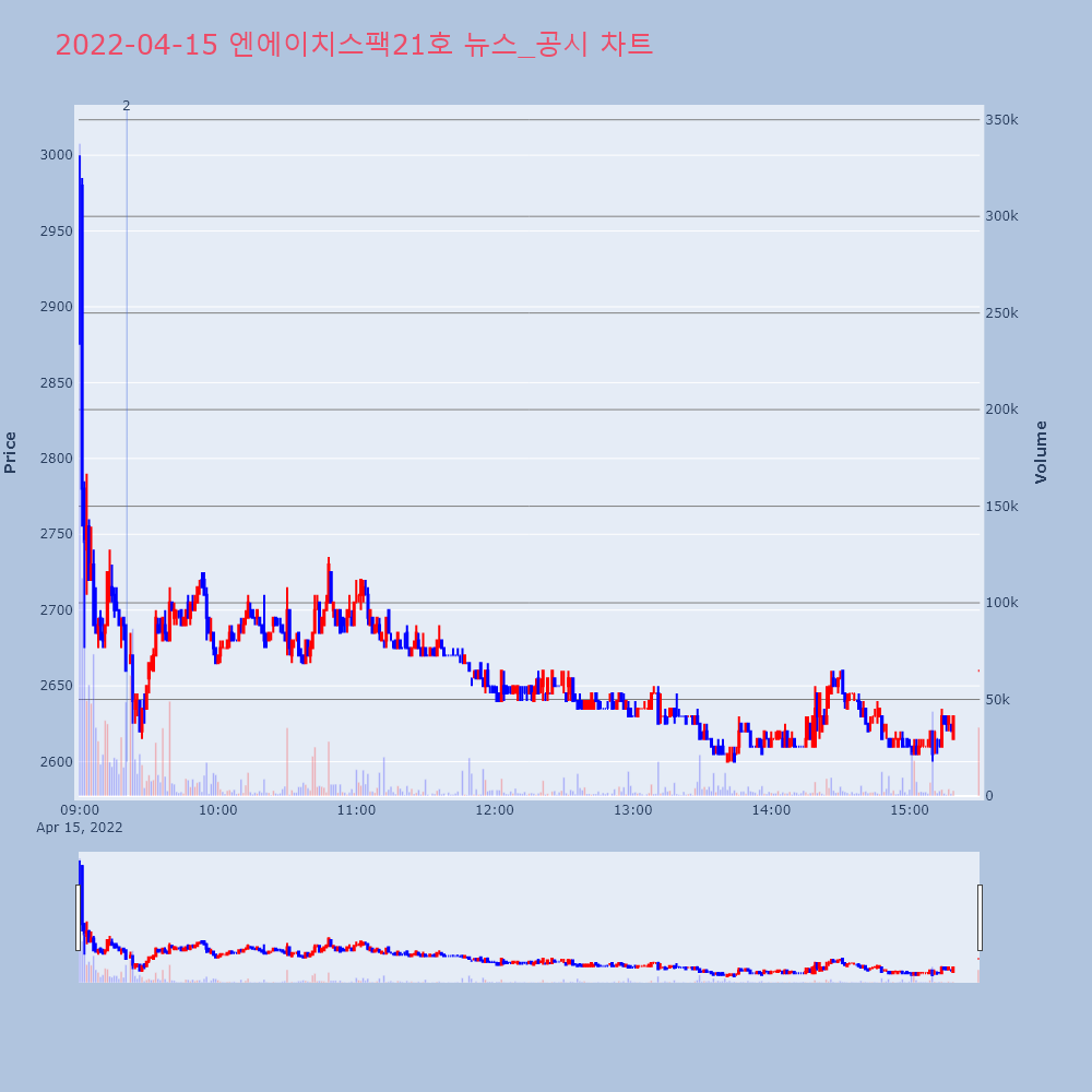 | 2 | 엔에이치스팩21호, -9.83% VI 발동엔에이치스팩21호(391710)가 VI가 발동했다. 전 | 조선경제 | 엔에이치스팩21호 | 2022-04-15 09:20:26 |