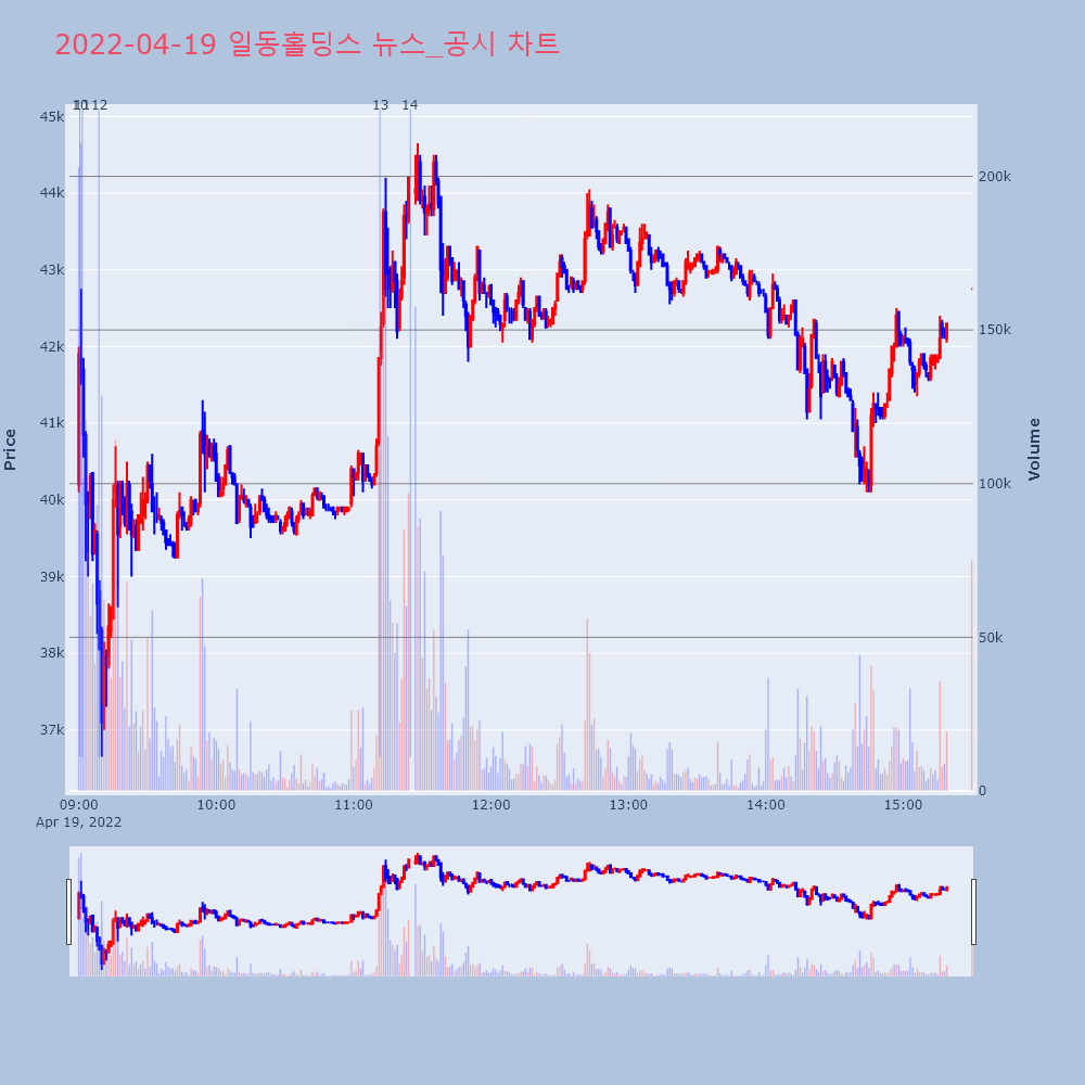 | 14 | 일동홀딩스, +13.48% VI 발동일동홀딩스(000230)가 VI가 발동했다. 전일 대비 | 조선경제 | 일동홀딩스 | 2022-04-19 11:24:46 |