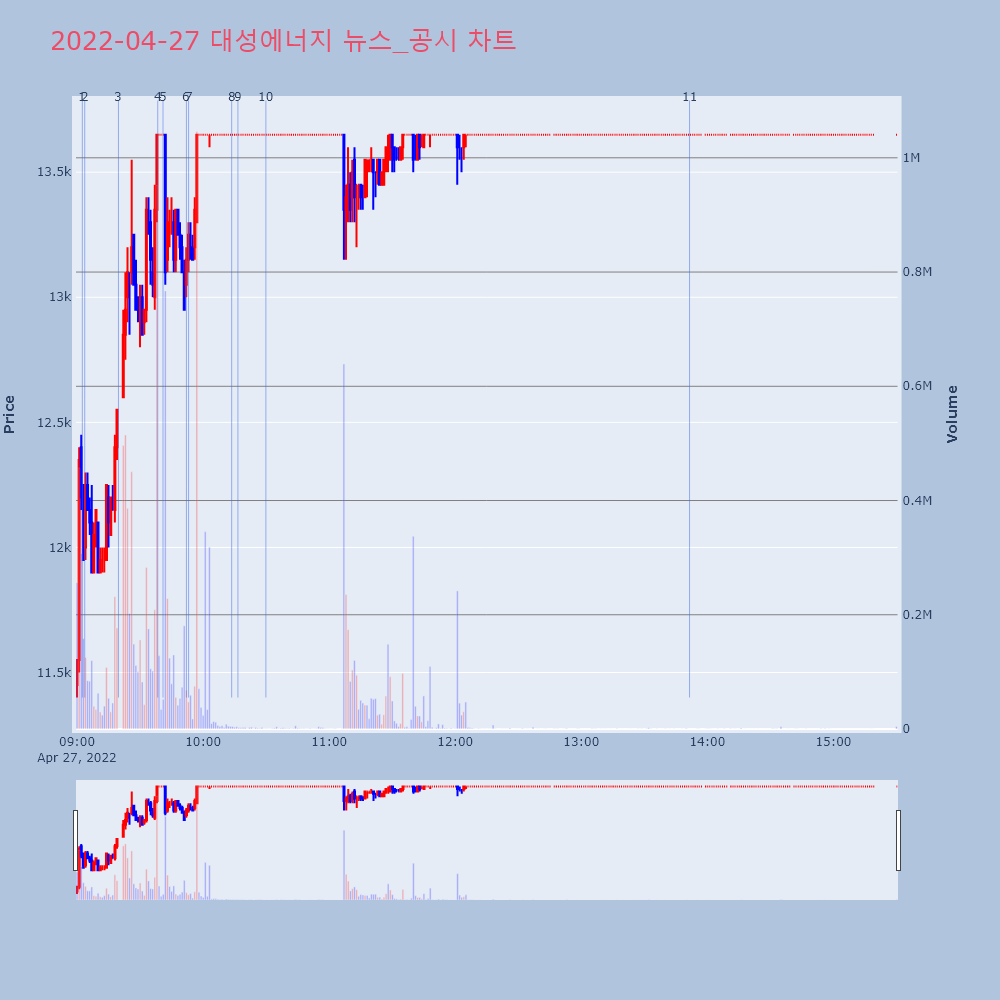 | 8 | 4월 27일 오후장 급등주 PICK5 - 대성에너지, 지에스이, 파이버프로... 최적의 매매타이밍을 실시간으로 전송하여 투자자들에게 도 | 파이낸셜 | 중앙에너비스 | 2022-04-27 13:51:30 |
